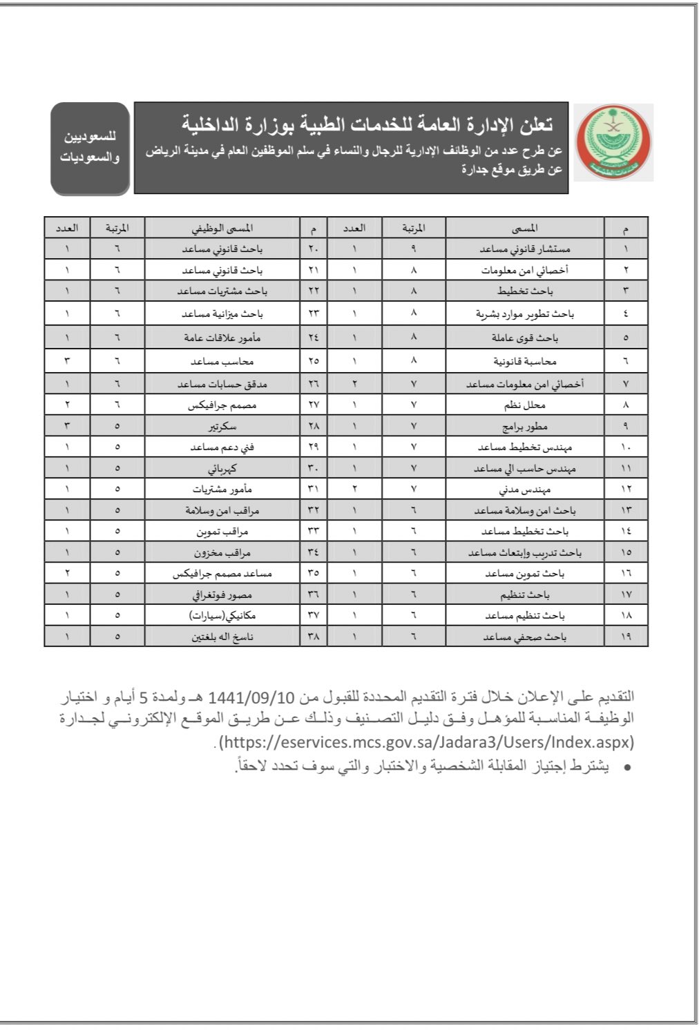 الخدمات الطبية بوزارة الداخلية On Twitter تعلن الإدارة العامة للخدمات الطبية بوزارة الداخلية عن طرح عدد من الوظائف الإدارية للرجال والنساء في سلم الموظفين العام في مدينة الرياض عن طريق موقع جدارة