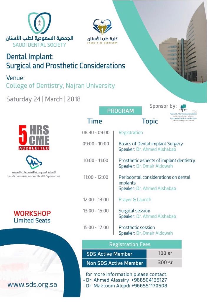 بالإشتراك مع الجمعية السعودية لطب الأسنان كلية طب الأسنان تقيم اليوم العلمي الأول لزراعة الأسنان يوم السبت 24 مارس 2018