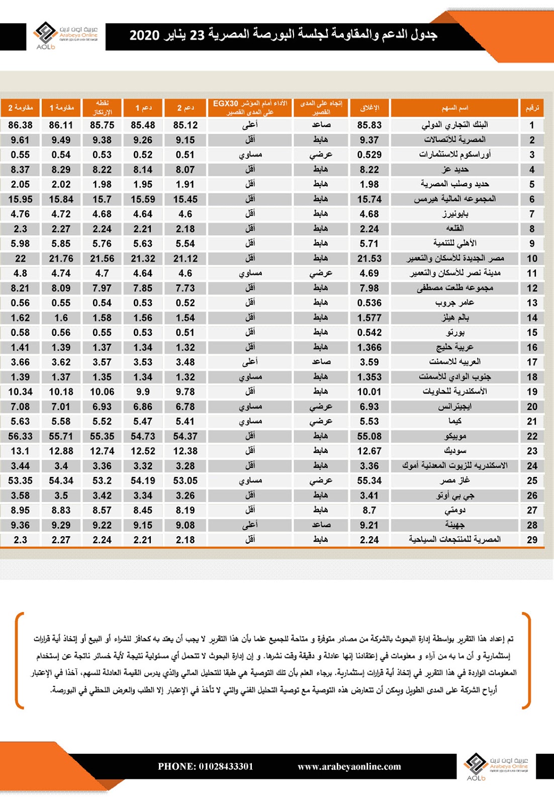 جدول الدعم والمقاومة لجلسة يوم الخميس 23 1 2020 مقدم من شركة عربية اون لاين للوساطة فى الاوراق المالية