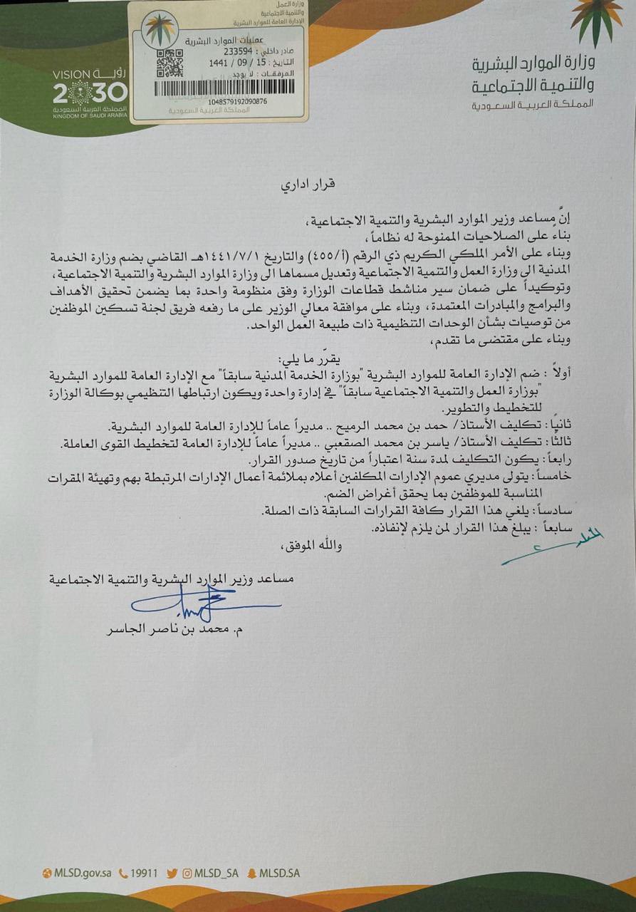 التعيينات A Twitter وزارة الموارد البشرية والتنمية الاجتماعية ضم الإدارة العامة للموارد البشرية بـ وزارة الخدمة المدنية سابقا مع الإدارة العامة للموارد البشرية بـ وزارة العمل والتنمية الإجتماعية سابقا تحت إدارة واحدة بمسمى الإدارة العامة للموارد