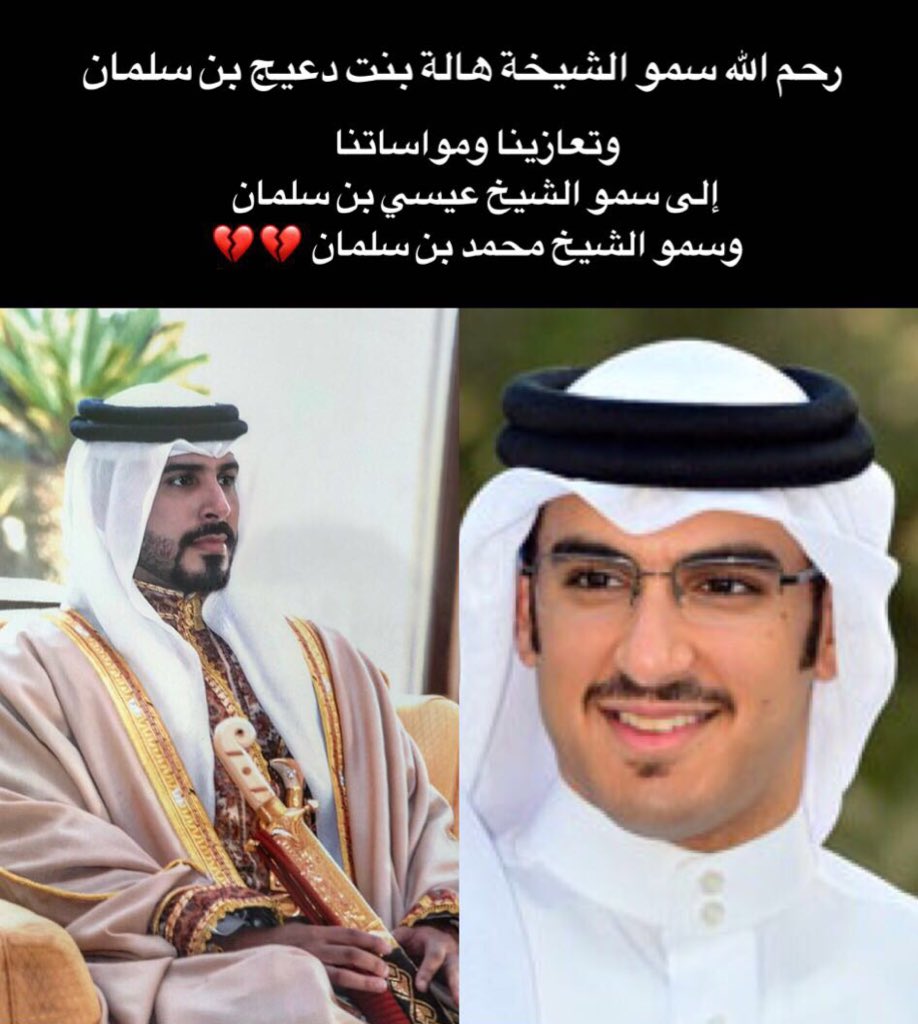 غـادة البحرين No Twitter تعازينا ومواساتنا لسمو الشيخ عيسى بن سلمان بن حمد آل خليفة وسمو الشيخ محمد بن سلمان آل خليفة في وفاة والدتهم الشابة صاحبة السمو الشيخة هالة بنت دعيج