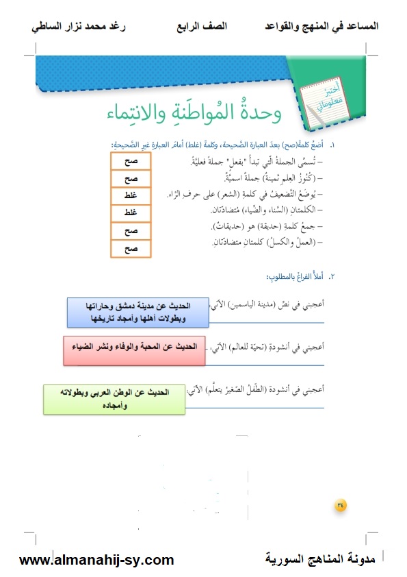 اوراق عمل وحدة المواطنة الانتماء في اللغة العربية للصف الرابع الفصل الثاني